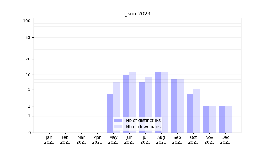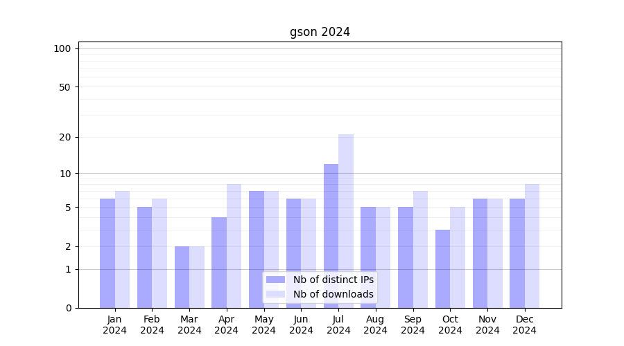 Number of downloads for experiment package gson, year by year, from 2025 back to 2014 (years with no downloads are omitted):