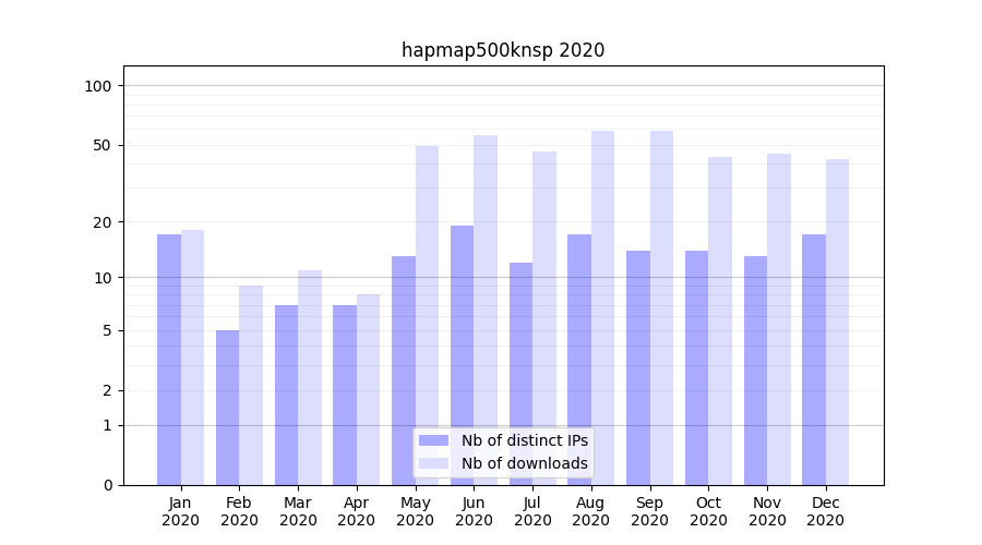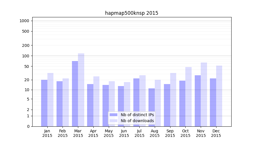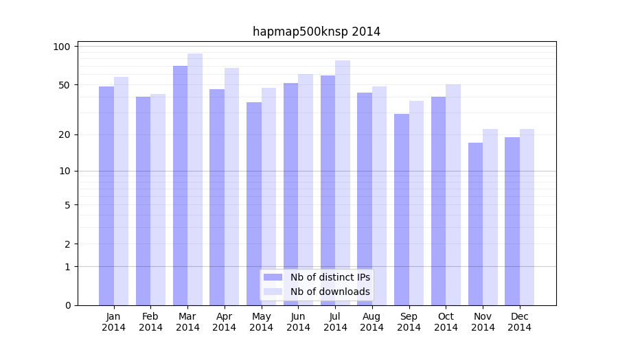 Number of downloads for experiment package hapmap500knsp, year by year, from 2025 back to 2014 (years with no downloads are omitted):