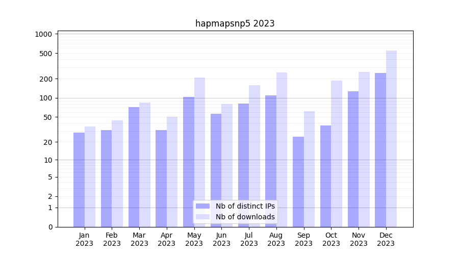 Number of downloads for experiment package hapmapsnp5, year by year, from 2025 back to 2014 (years with no downloads are omitted):