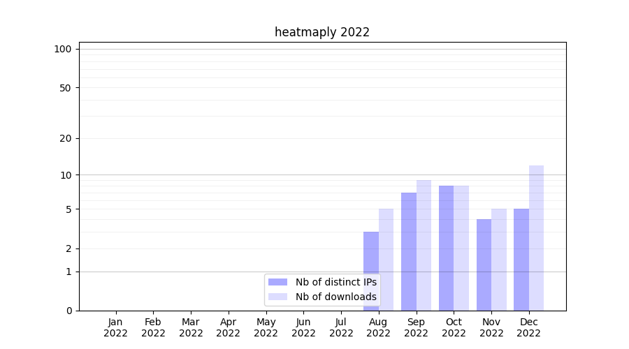 Number of downloads for experiment package heatmaply, year by year, from 2025 back to 2014 (years with no downloads are omitted):