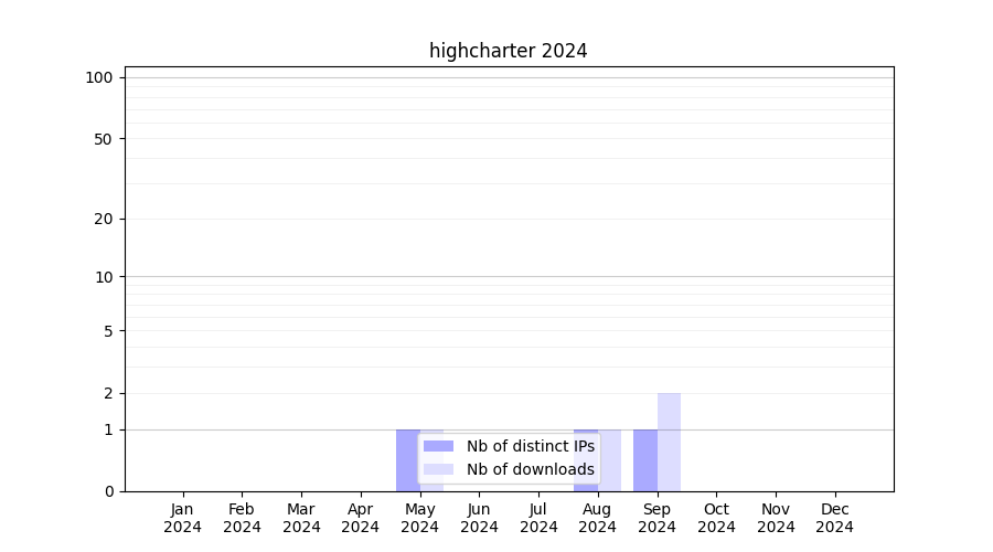Number of downloads for experiment package highcharter, year by year, from 2025 back to 2014 (years with no downloads are omitted):