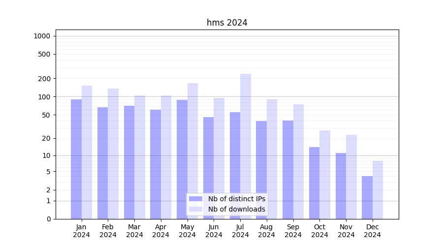 Number of downloads for experiment package hms, year by year, from 2025 back to 2014 (years with no downloads are omitted):