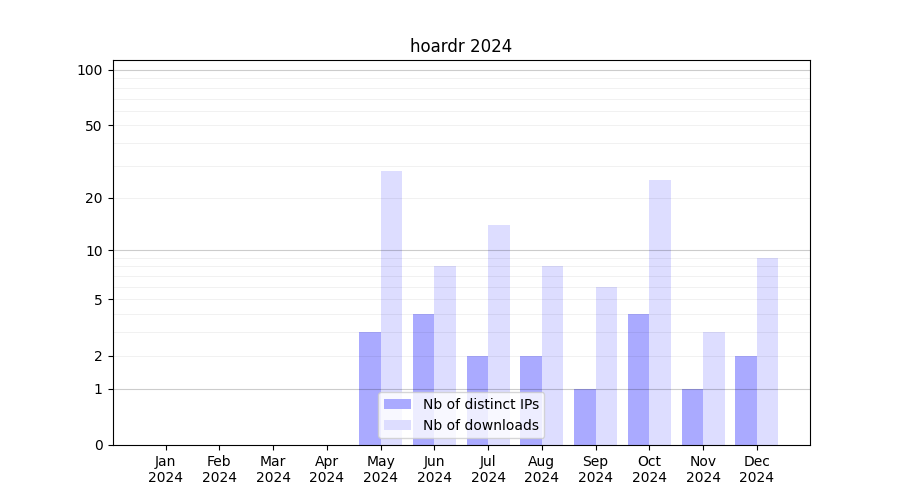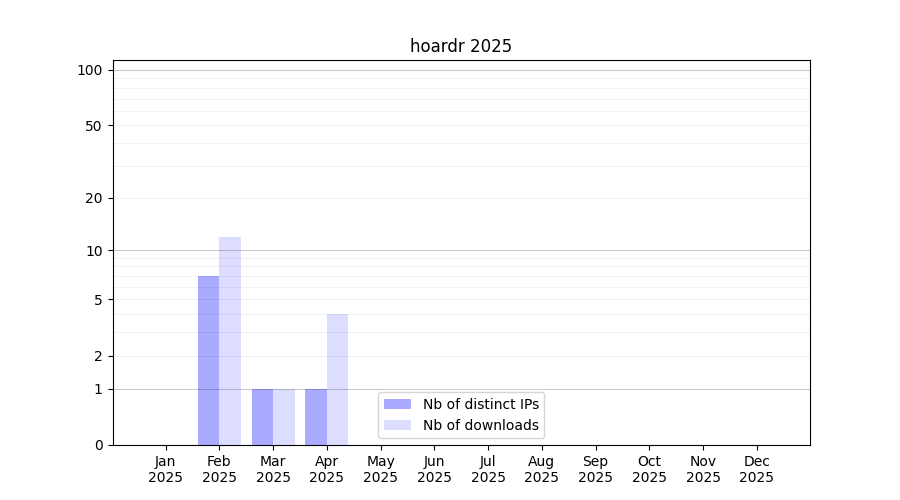 Number of downloads for experiment package hoardr, year by year, from 2025 back to 2014 (years with no downloads are omitted):