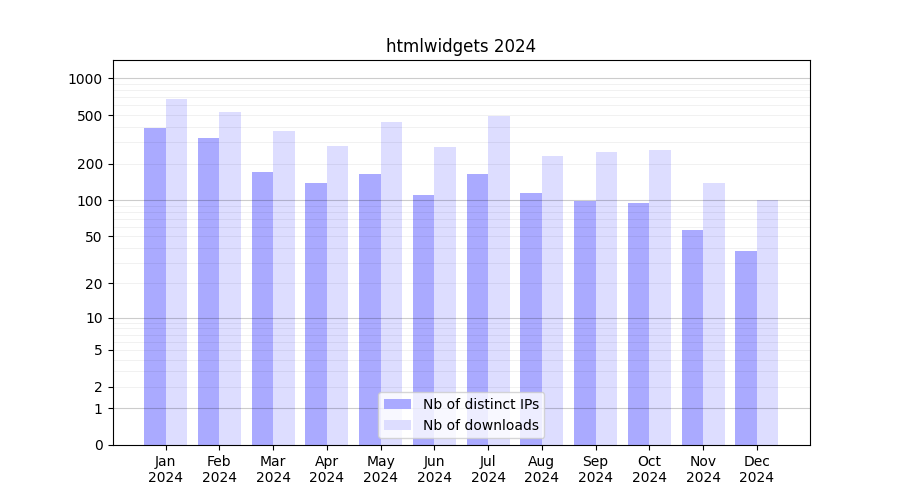 Number of downloads for experiment package htmlwidgets, year by year, from 2025 back to 2014 (years with no downloads are omitted):