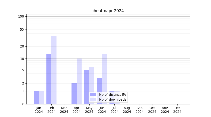 Number of downloads for experiment package iheatmapr, year by year, from 2025 back to 2014 (years with no downloads are omitted):