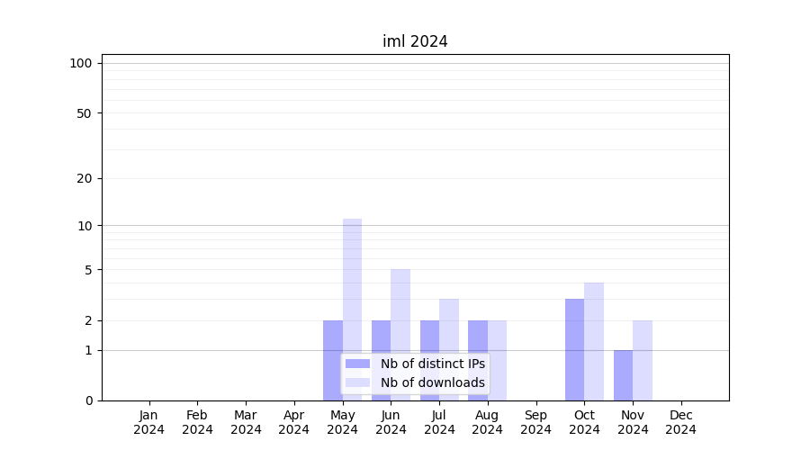 Number of downloads for experiment package iml, year by year, from 2025 back to 2014 (years with no downloads are omitted):