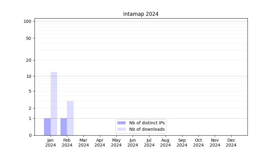 Number of downloads for experiment package intamap, year by year, from 2025 back to 2014 (years with no downloads are omitted):