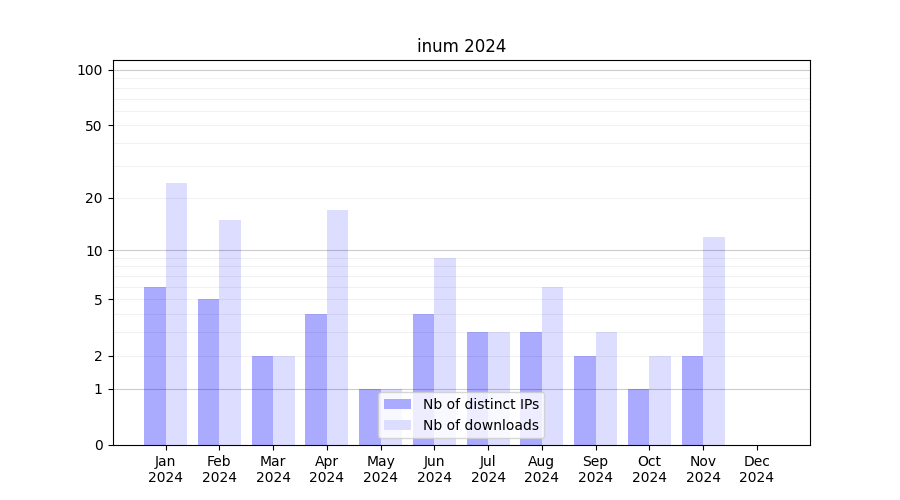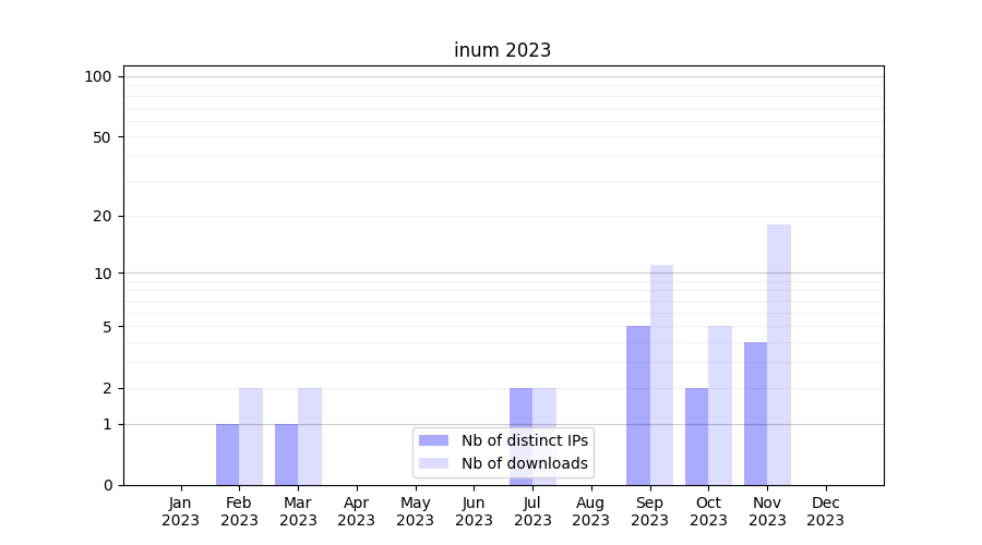 Number of downloads for experiment package inum, year by year, from 2025 back to 2014 (years with no downloads are omitted):