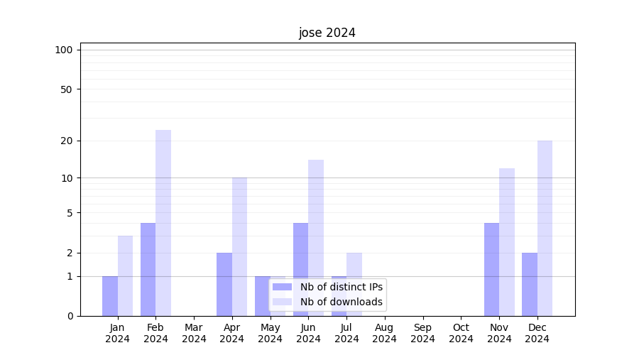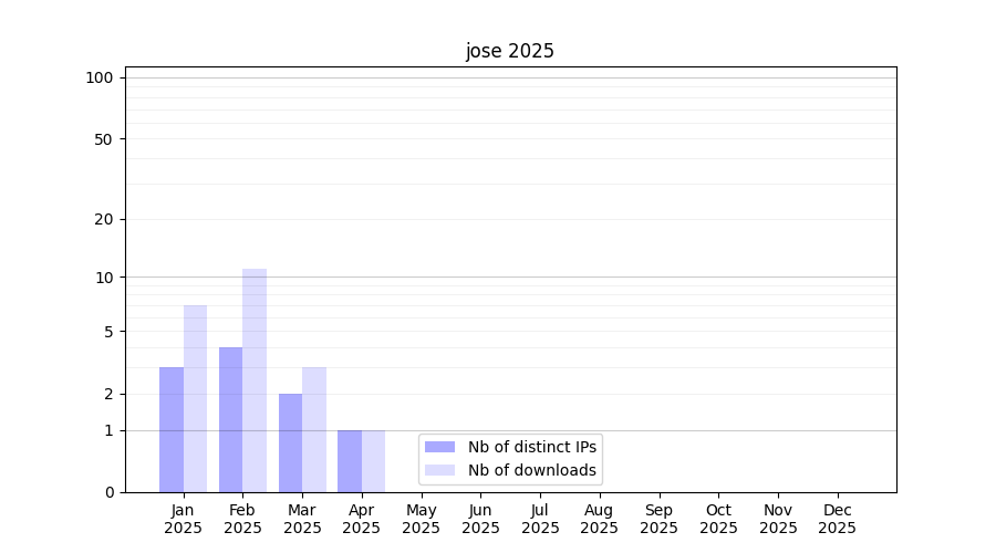 Number of downloads for experiment package jose, year by year, from 2025 back to 2014 (years with no downloads are omitted):