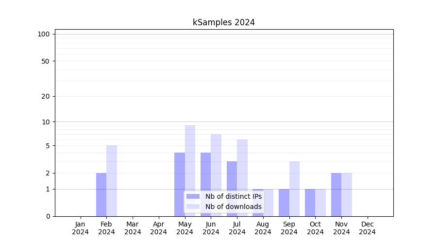 Number of downloads for experiment package kSamples, year by year, from 2025 back to 2014 (years with no downloads are omitted):