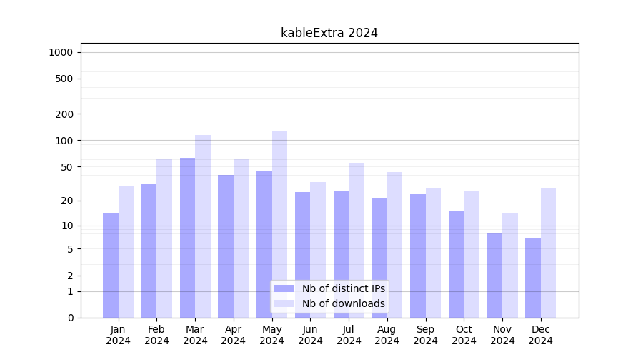 Number of downloads for experiment package kableExtra, year by year, from 2025 back to 2014 (years with no downloads are omitted):