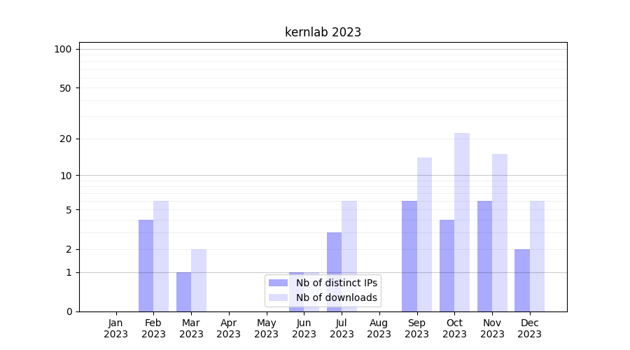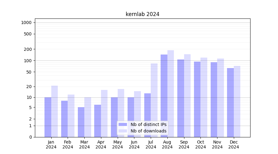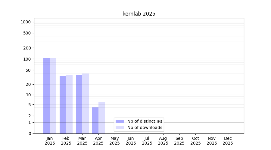 Number of downloads for experiment package kernlab, year by year, from 2025 back to 2014 (years with no downloads are omitted):