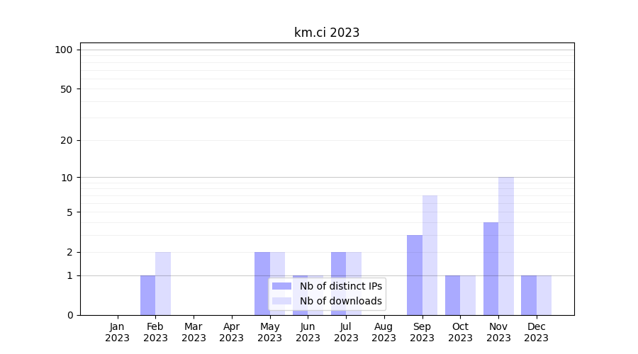 Number of downloads for experiment package km.ci, year by year, from 2025 back to 2014 (years with no downloads are omitted):