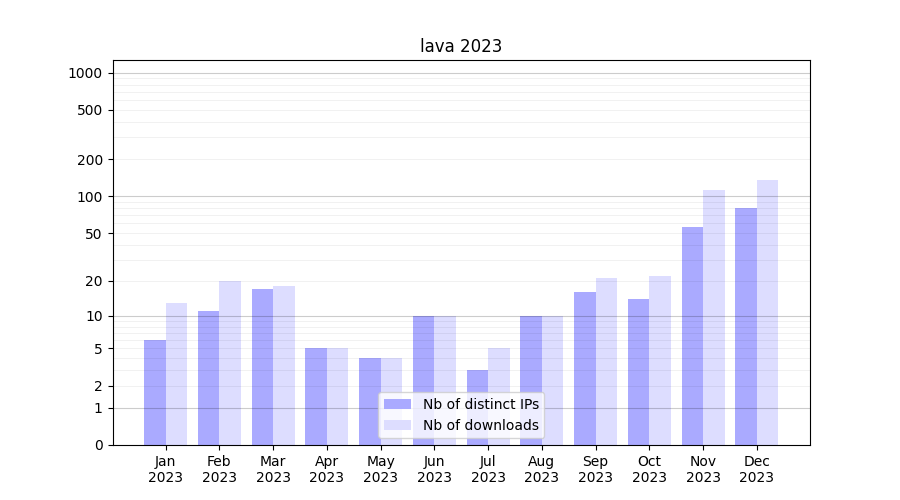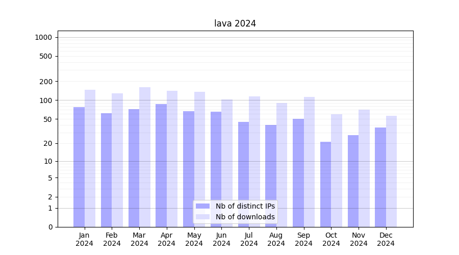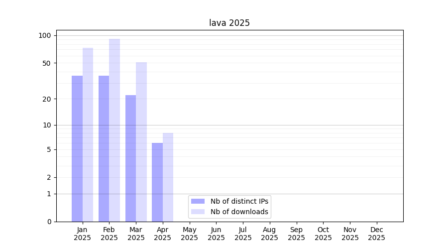Number of downloads for experiment package lava, year by year, from 2025 back to 2014 (years with no downloads are omitted):