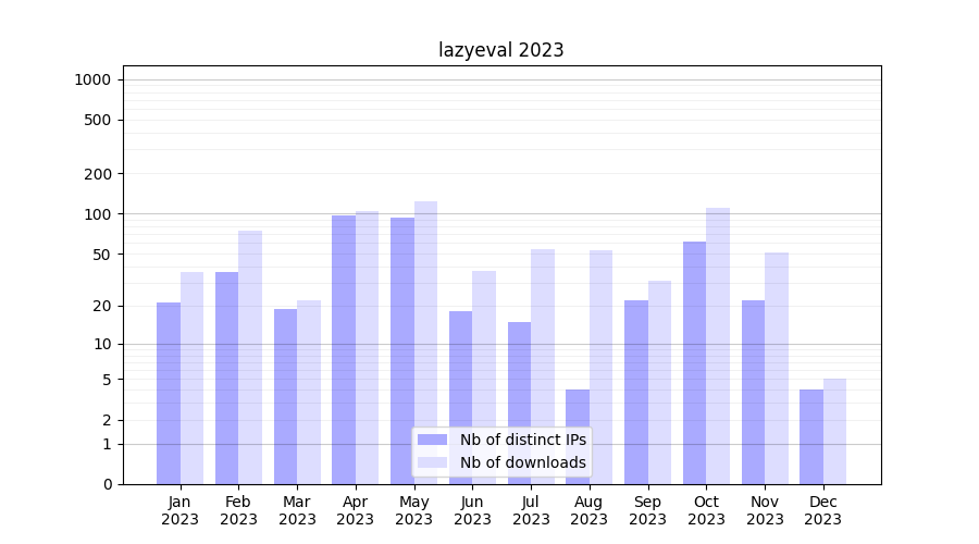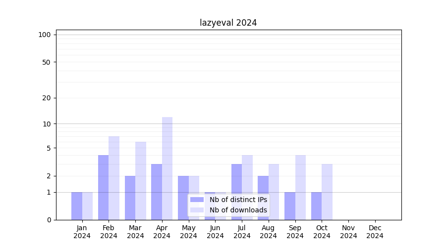 Number of downloads for experiment package lazyeval, year by year, from 2025 back to 2014 (years with no downloads are omitted):