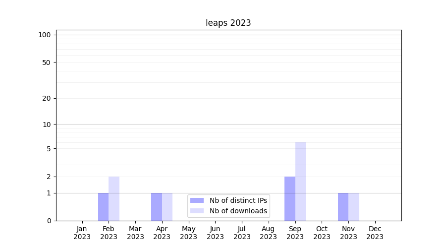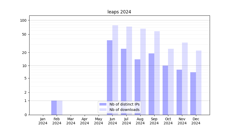 Number of downloads for experiment package leaps, year by year, from 2025 back to 2014 (years with no downloads are omitted):