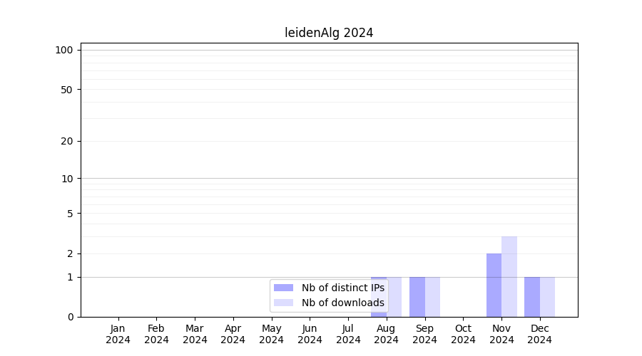 Number of downloads for experiment package leidenAlg, year by year, from 2025 back to 2014 (years with no downloads are omitted):