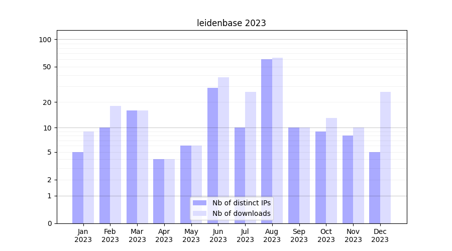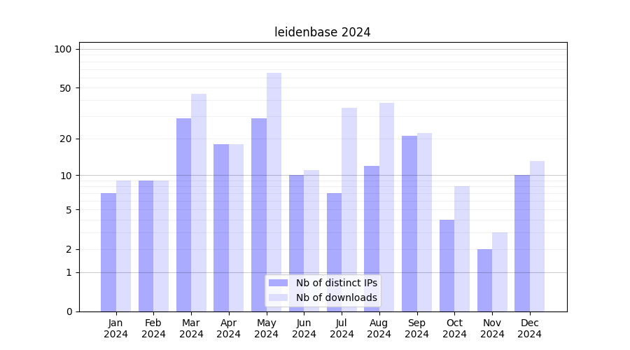 Number of downloads for experiment package leidenbase, year by year, from 2025 back to 2014 (years with no downloads are omitted):