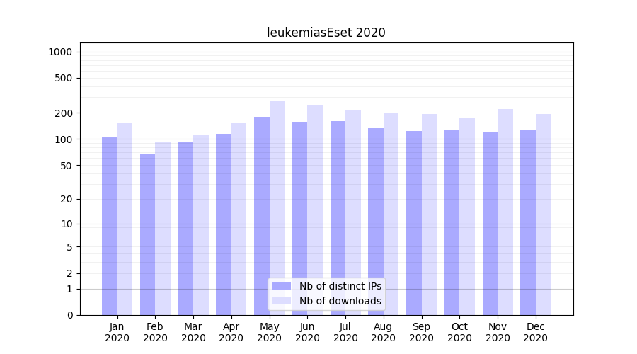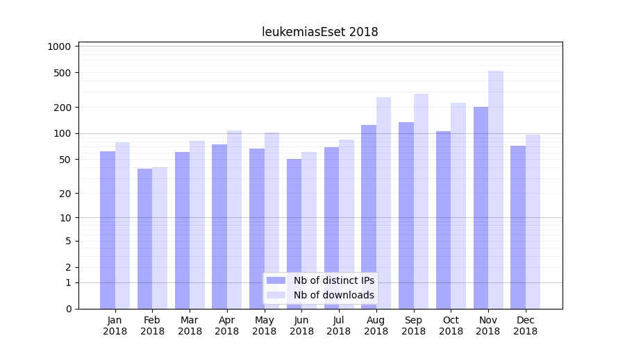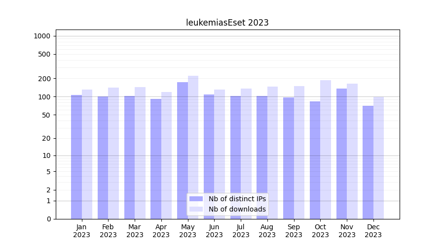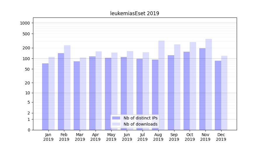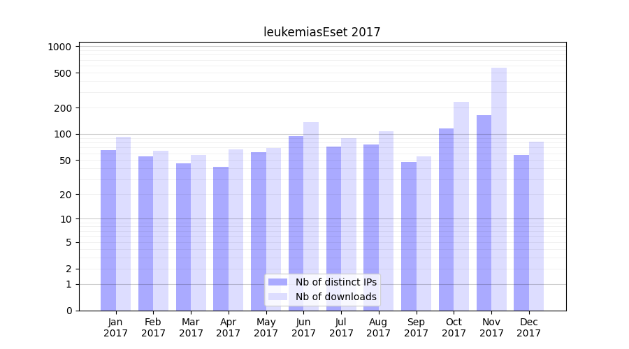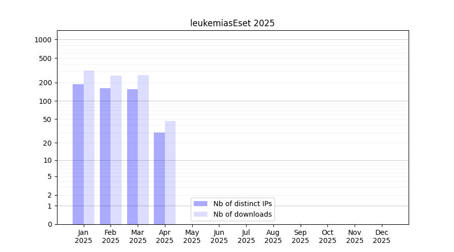 Number of downloads for experiment package leukemiasEset, year by year, from 2025 back to 2014 (years with no downloads are omitted):