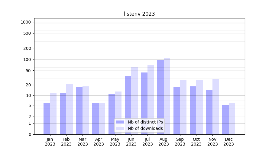 Number of downloads for experiment package listenv, year by year, from 2025 back to 2014 (years with no downloads are omitted):