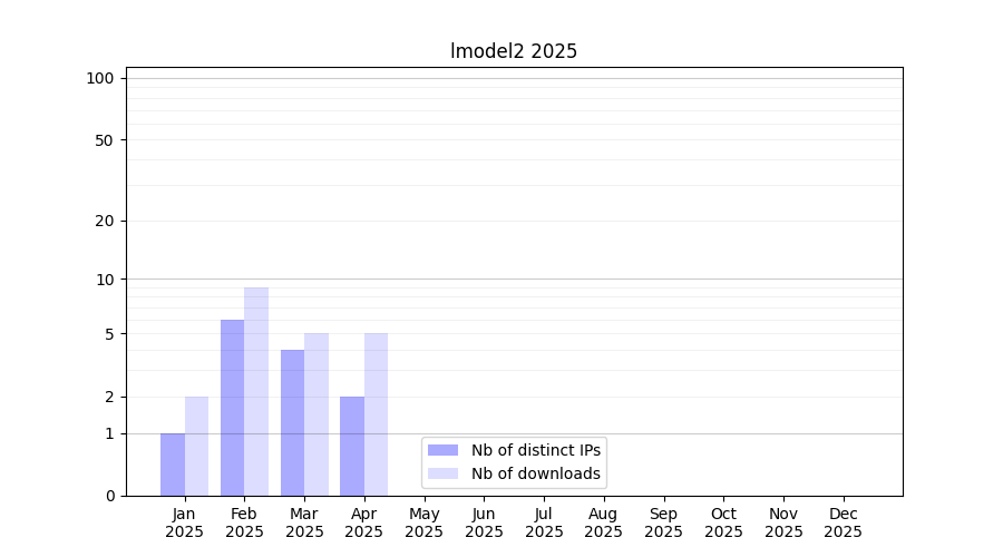 Number of downloads for experiment package lmodel2, year by year, from 2025 back to 2014 (years with no downloads are omitted):