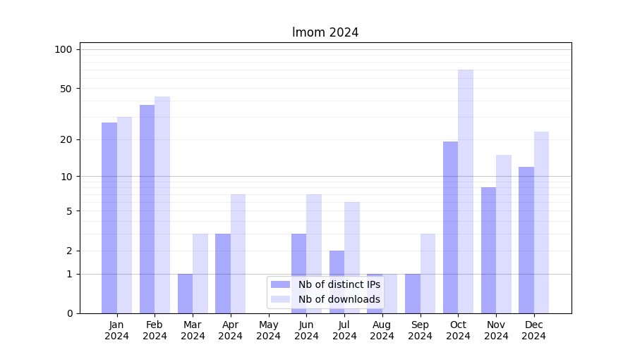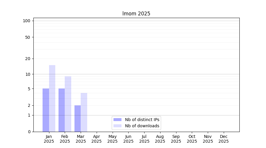 Number of downloads for experiment package lmom, year by year, from 2025 back to 2014 (years with no downloads are omitted):