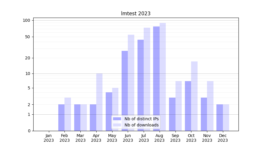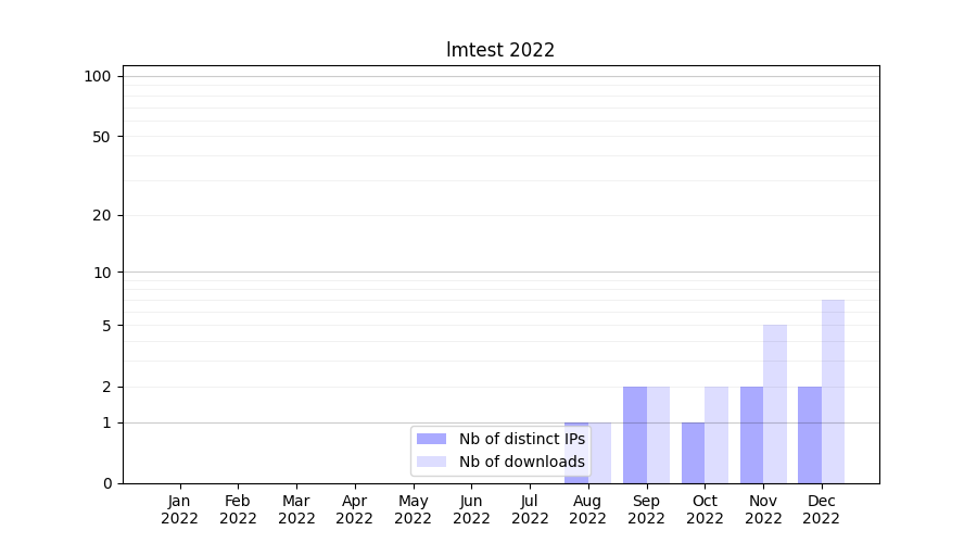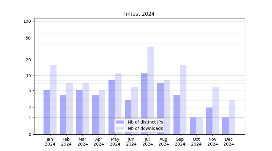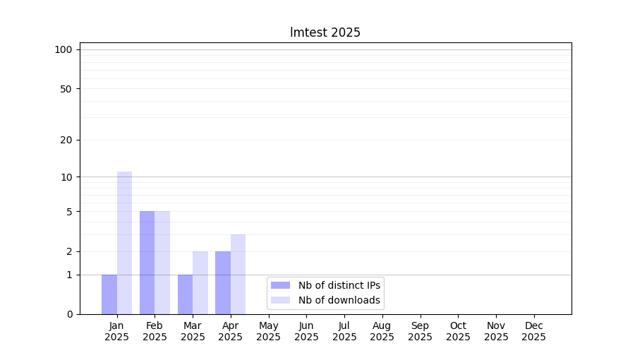 Number of downloads for experiment package lmtest, year by year, from 2025 back to 2014 (years with no downloads are omitted):