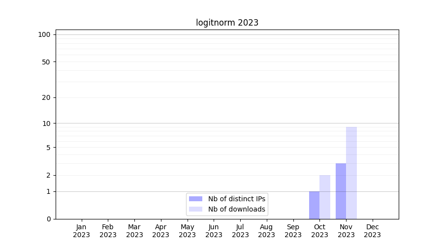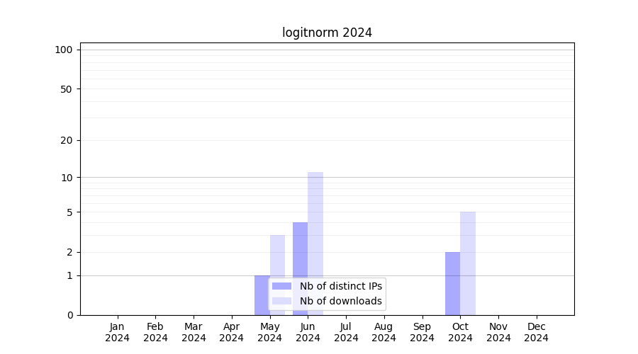 Number of downloads for experiment package logitnorm, year by year, from 2025 back to 2014 (years with no downloads are omitted):
