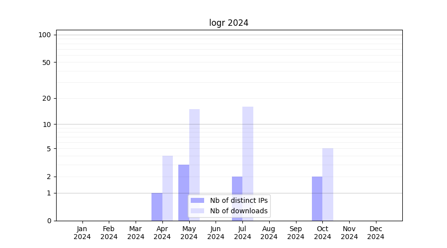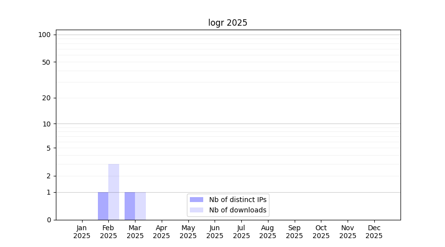 Number of downloads for experiment package logr, year by year, from 2025 back to 2014 (years with no downloads are omitted):