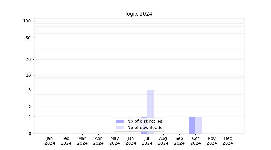 Number of downloads for experiment package logrx, year by year, from 2025 back to 2014 (years with no downloads are omitted):