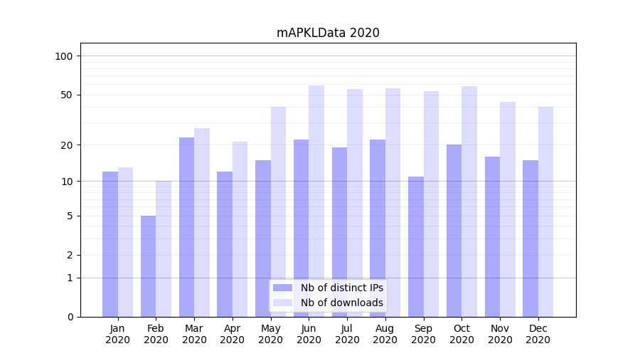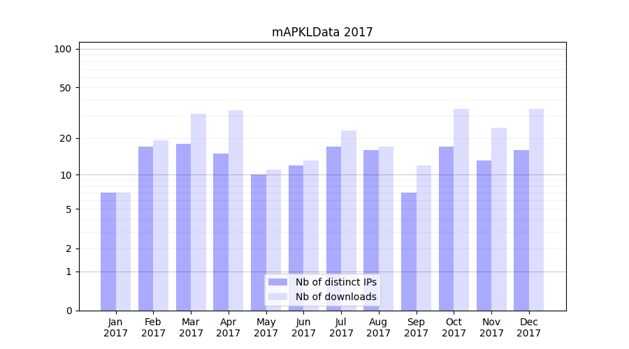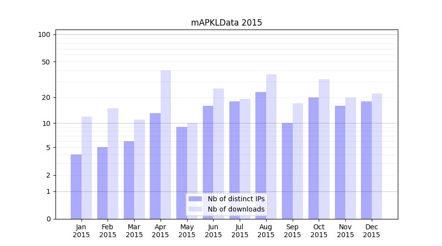 Number of downloads for experiment package mAPKLData, year by year, from 2025 back to 2014 (years with no downloads are omitted):