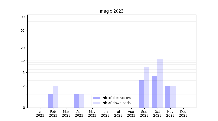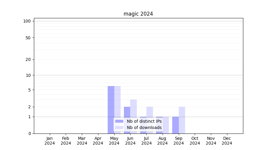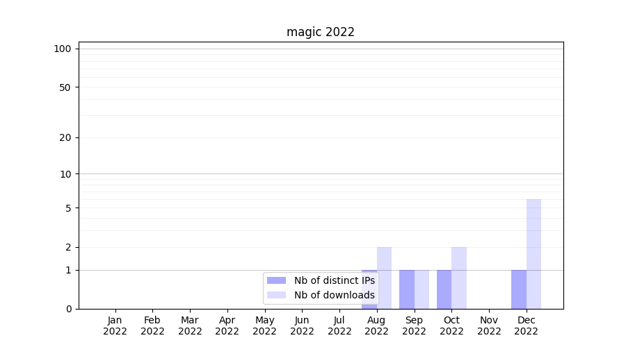 Number of downloads for experiment package magic, year by year, from 2025 back to 2014 (years with no downloads are omitted):