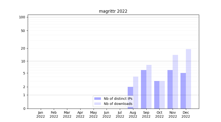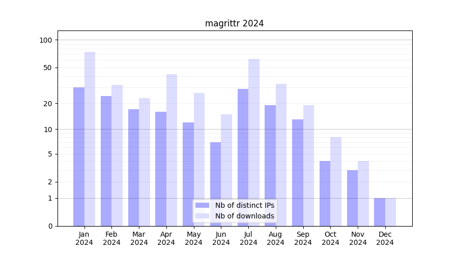 Number of downloads for experiment package magrittr, year by year, from 2025 back to 2014 (years with no downloads are omitted):