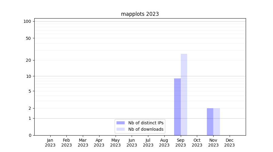 Number of downloads for experiment package mapplots, year by year, from 2025 back to 2014 (years with no downloads are omitted):