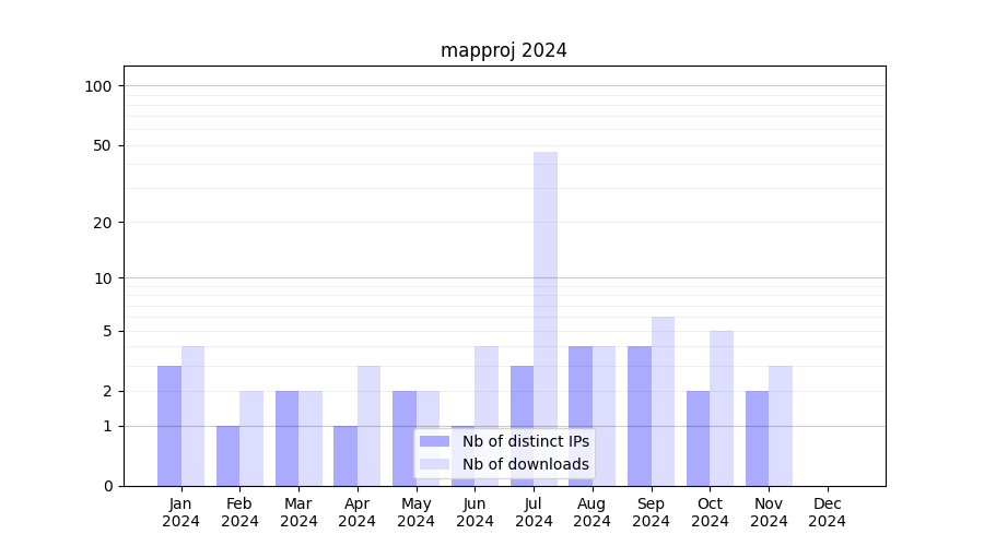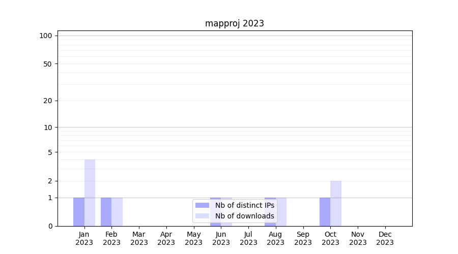 Number of downloads for experiment package mapproj, year by year, from 2025 back to 2014 (years with no downloads are omitted):