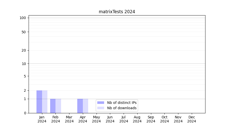 Number of downloads for experiment package matrixTests, year by year, from 2025 back to 2014 (years with no downloads are omitted):