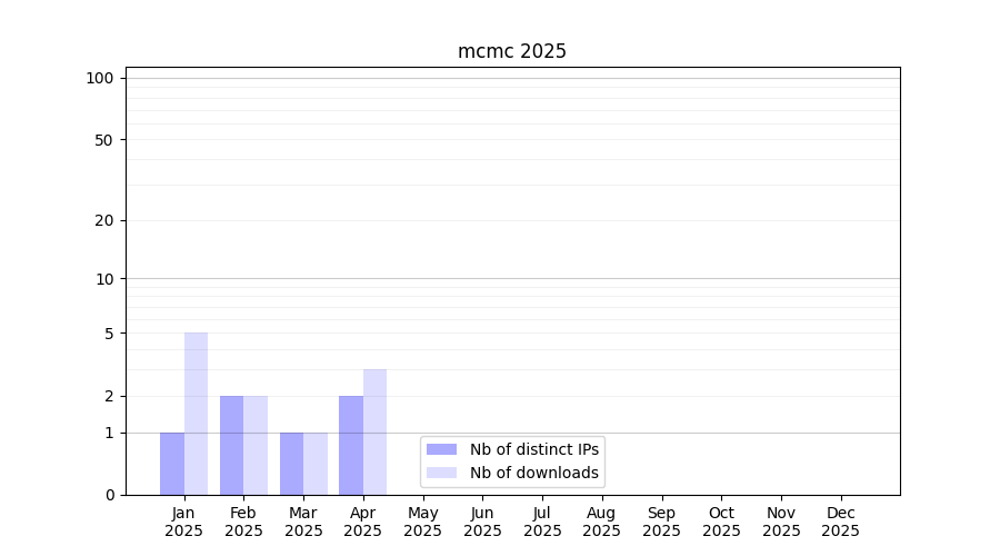 Number of downloads for experiment package mcmc, year by year, from 2025 back to 2014 (years with no downloads are omitted):