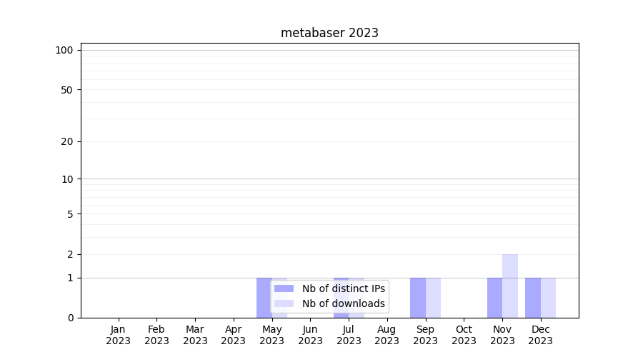 Number of downloads for experiment package metabaser, year by year, from 2025 back to 2014 (years with no downloads are omitted):