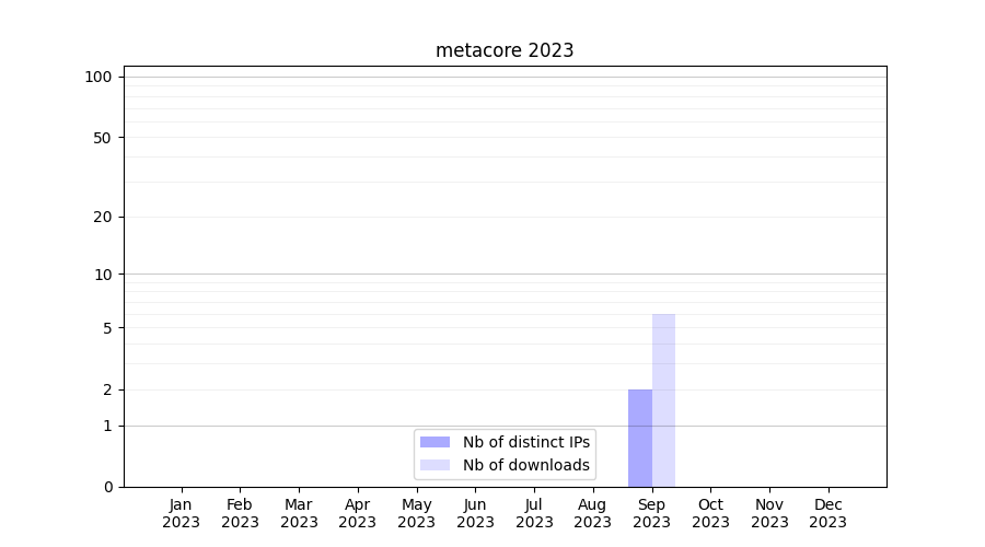 Number of downloads for experiment package metacore, year by year, from 2025 back to 2014 (years with no downloads are omitted):