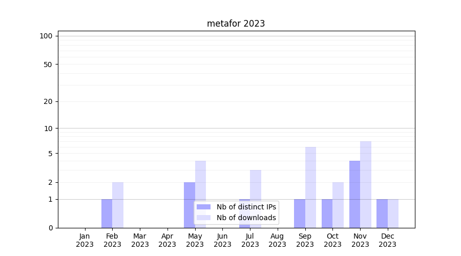 Number of downloads for experiment package metafor, year by year, from 2025 back to 2014 (years with no downloads are omitted):