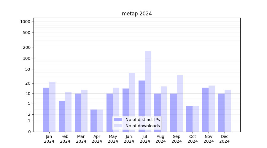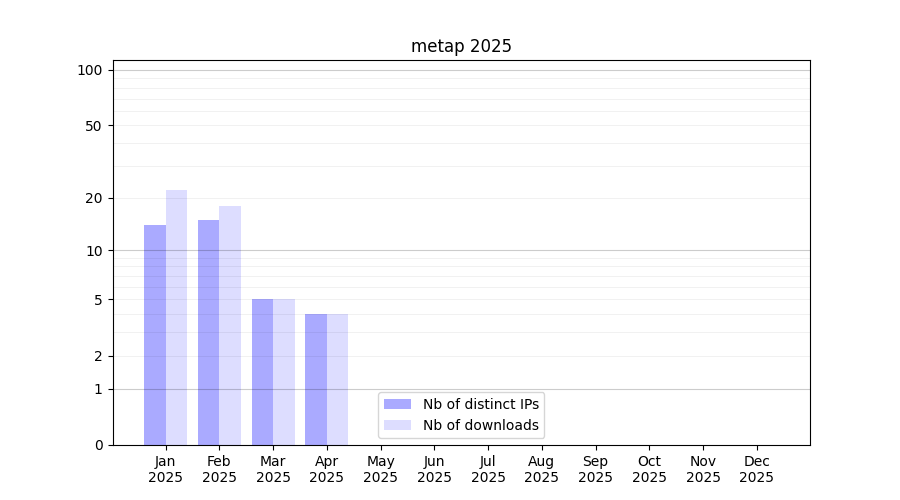 Number of downloads for experiment package metap, year by year, from 2025 back to 2014 (years with no downloads are omitted):