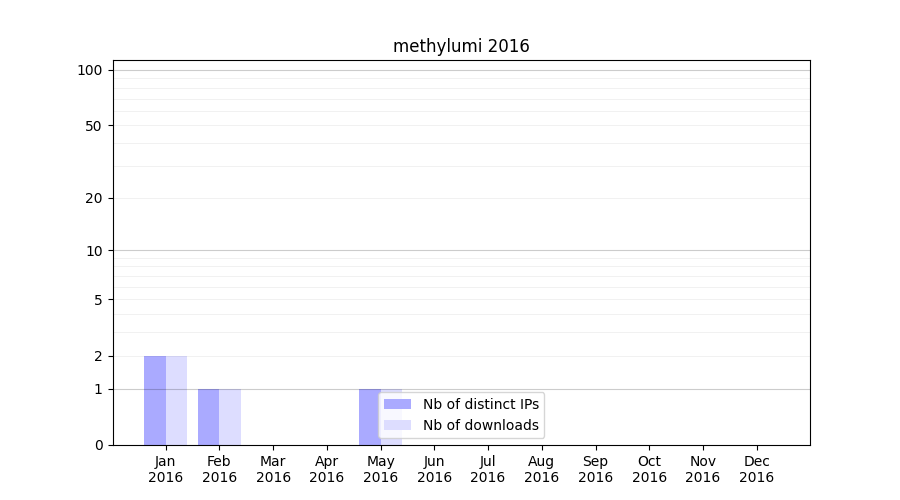 Number of downloads for experiment package methylumi, year by year, from 2025 back to 2014 (years with no downloads are omitted):
