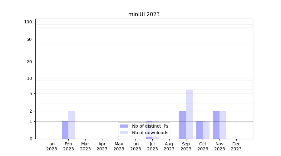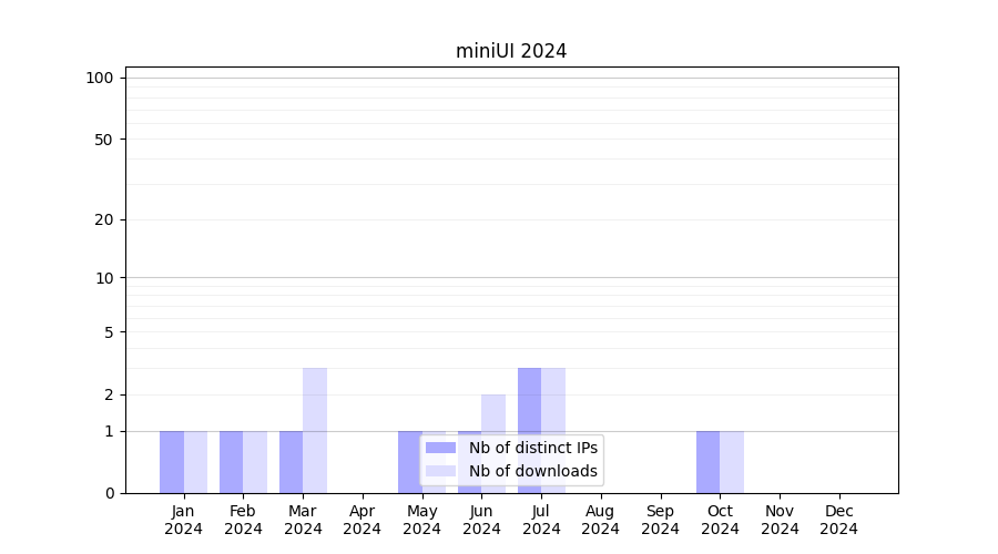Number of downloads for experiment package miniUI, year by year, from 2025 back to 2014 (years with no downloads are omitted):