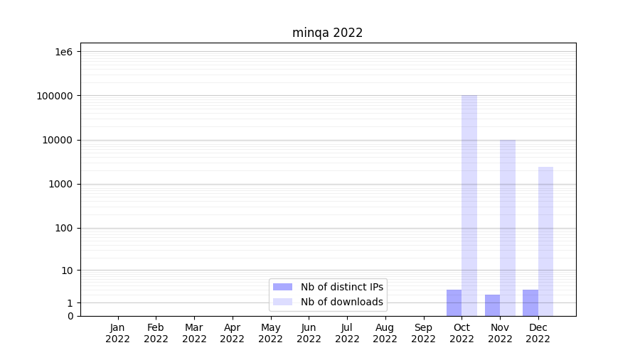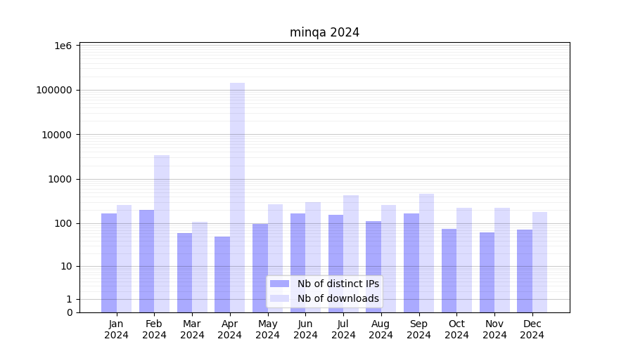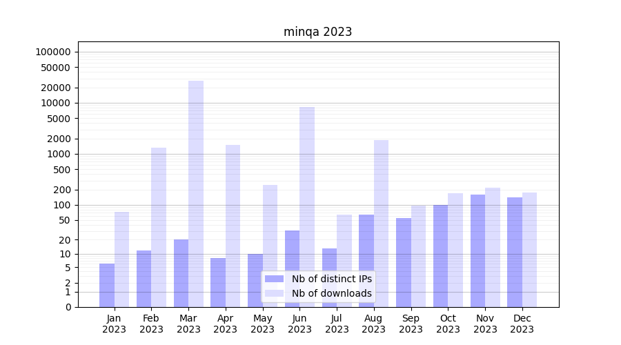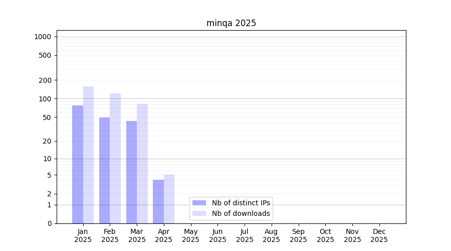 Number of downloads for experiment package minqa, year by year, from 2025 back to 2014 (years with no downloads are omitted):