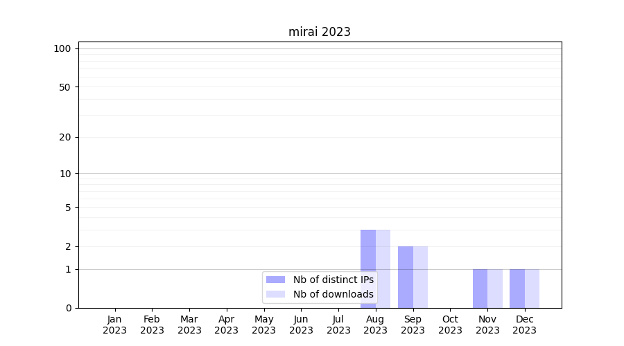 Number of downloads for experiment package mirai, year by year, from 2025 back to 2014 (years with no downloads are omitted):