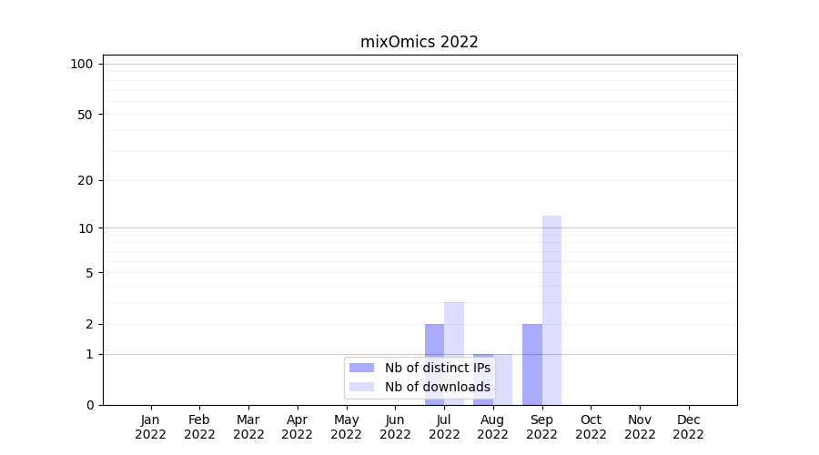 Number of downloads for experiment package mixOmics, year by year, from 2025 back to 2014 (years with no downloads are omitted):