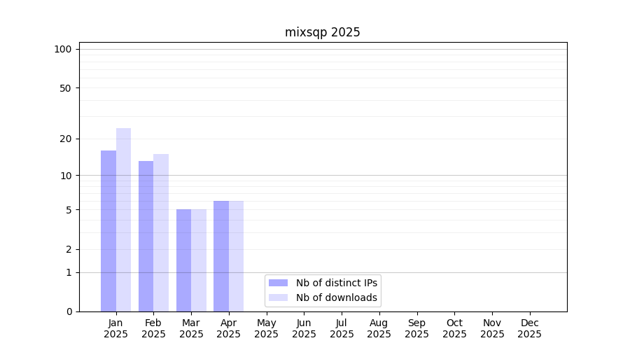 Number of downloads for experiment package mixsqp, year by year, from 2025 back to 2014 (years with no downloads are omitted):