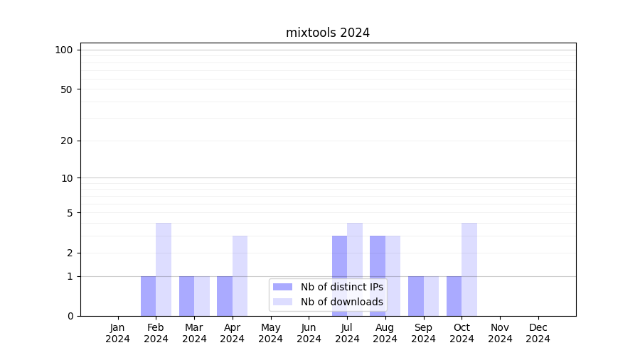 Number of downloads for experiment package mixtools, year by year, from 2025 back to 2014 (years with no downloads are omitted):