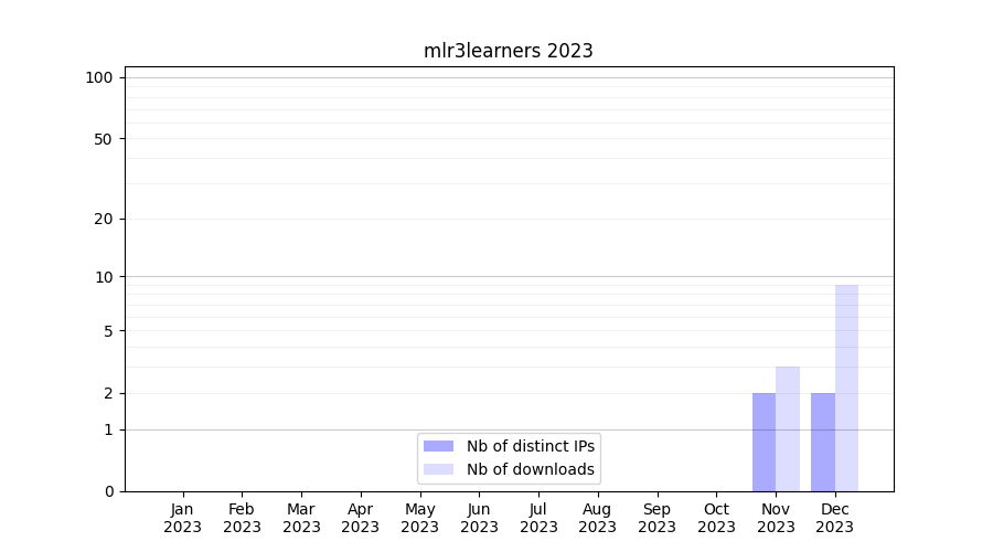 Number of downloads for experiment package mlr3learners, year by year, from 2025 back to 2014 (years with no downloads are omitted):