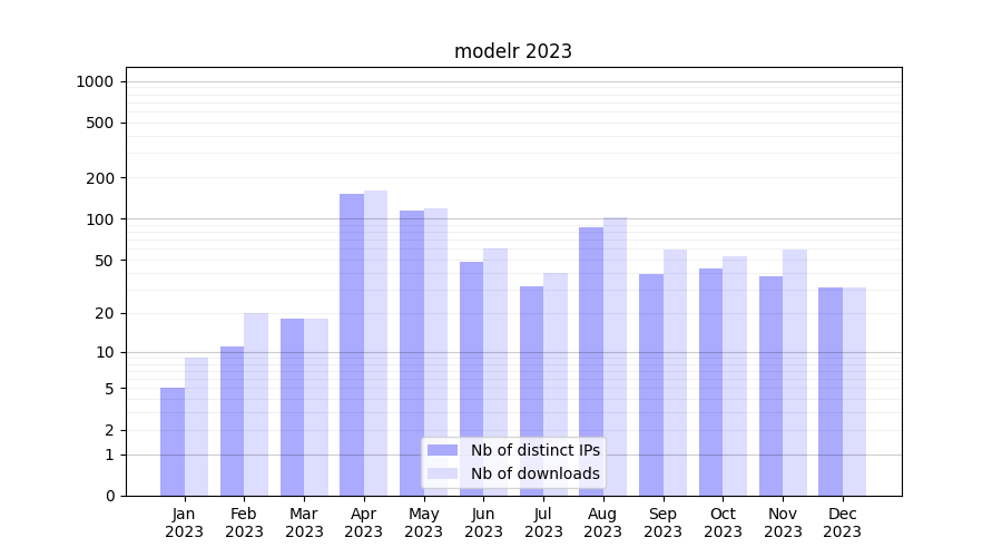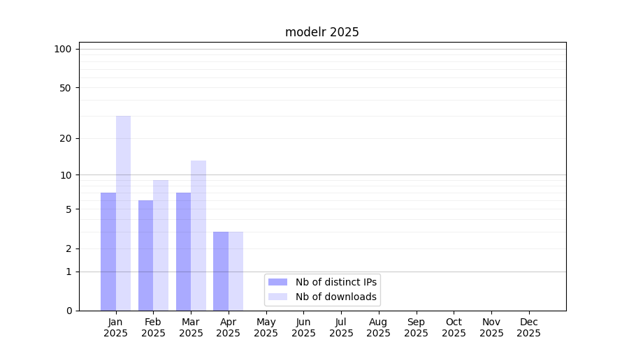 Number of downloads for experiment package modelr, year by year, from 2025 back to 2014 (years with no downloads are omitted):